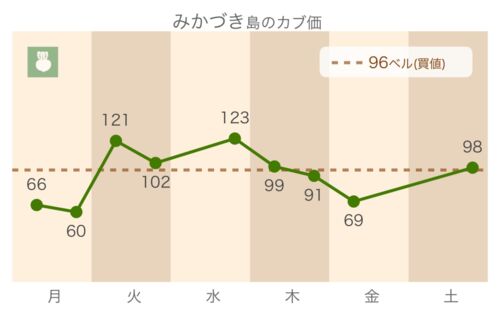 今週のカブ価遷移 午前のチェックは難しいわと思ってたら午後すらチェックできてない日がある…。今週は完全に波型でした。24日の買値は96、個数は2670。 フレンドが島を開けてくれたおかげでカブ爆死芸人にならなくて済みました!!