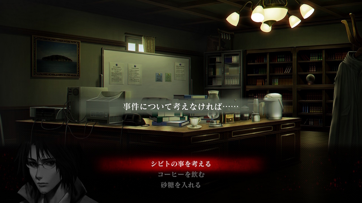 あれこれ考えを巡らせながら合間にコーヒーを飲んだり、コーヒーに砂糖を入れたりできます。こういうコマンド大好き。神宮寺三郎シリーズの「煙草を吸う」みたいなやつ。