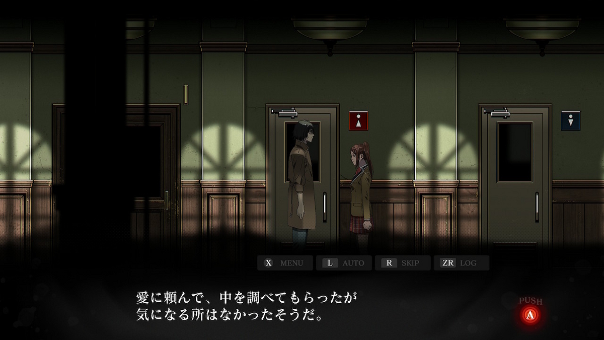 誰もいない部屋に侵入して何もできない状態だと自動で退室してくれるのは探索のテンポが上がっていいですね。トイレの調査は男女キャラそれぞれが担当するんですが、ここも初回のみ会話があって、以降はさっくりと結果が出されるのが良かったです。