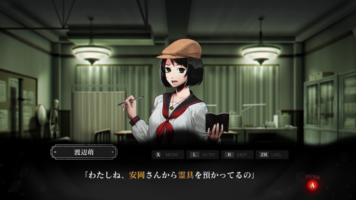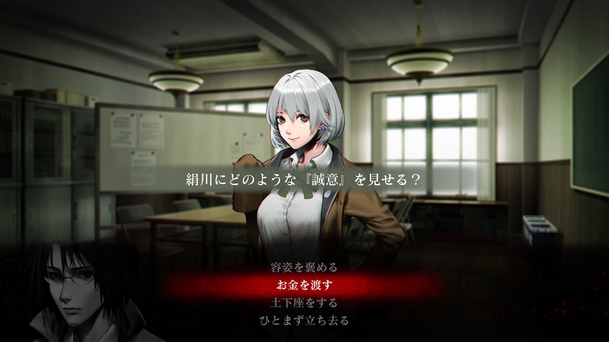 諸々の情報を集め、音楽準備室で取り乱していた堀越にハンカチを返し、あとは夜を待つのみというところで元印人の渡辺萌も合流。彼女は今回同行なしですが、こちらも元印人の安岡都和子からパラメーターアップの効果がある霊具を預かってきたとのこと。安岡さんはガチ霊能力者なのでちゃんと効果があります。
